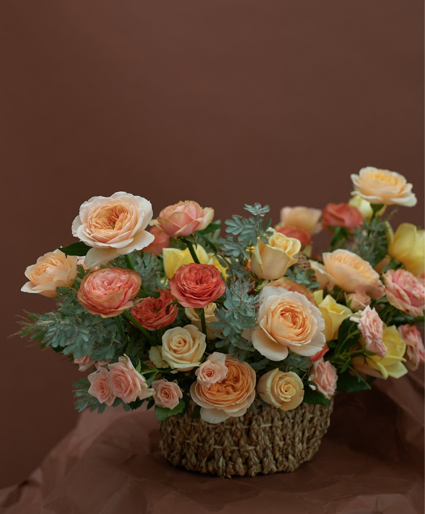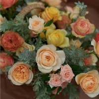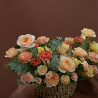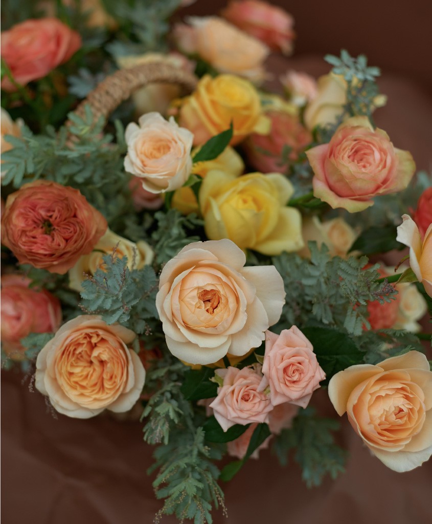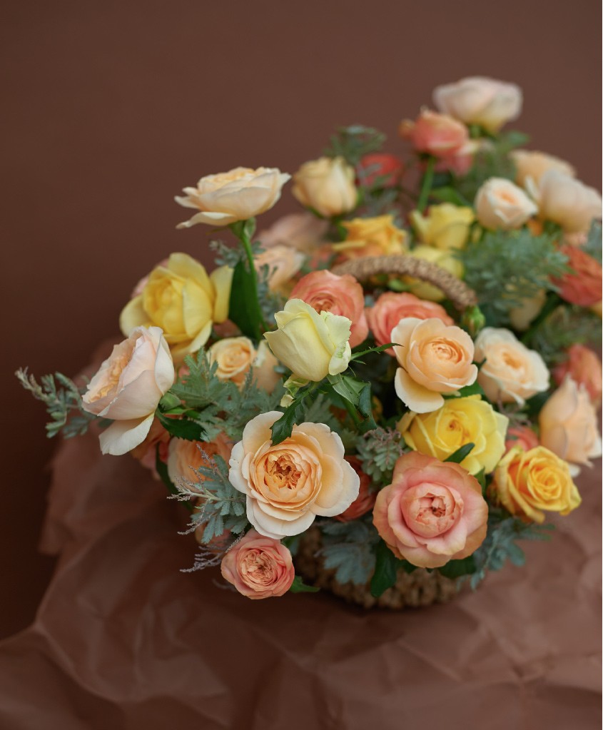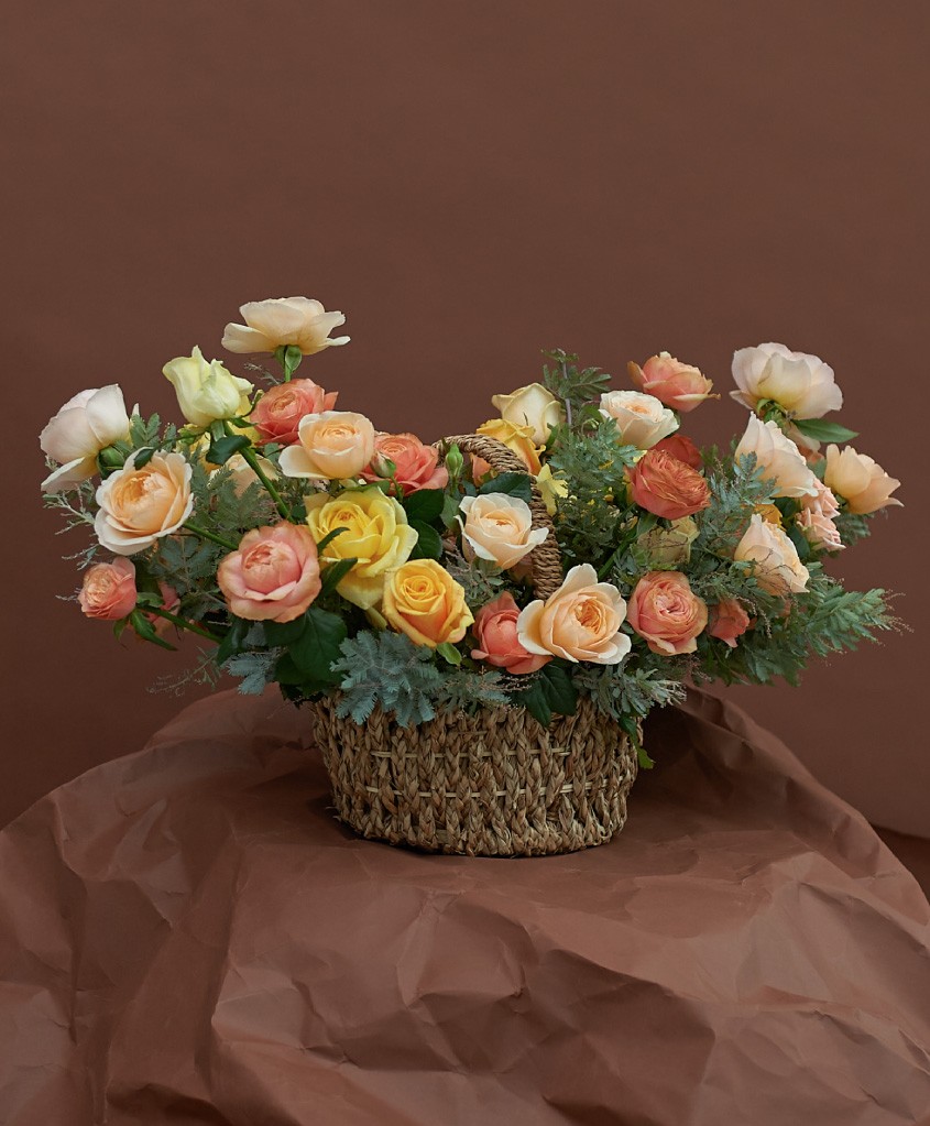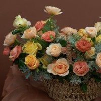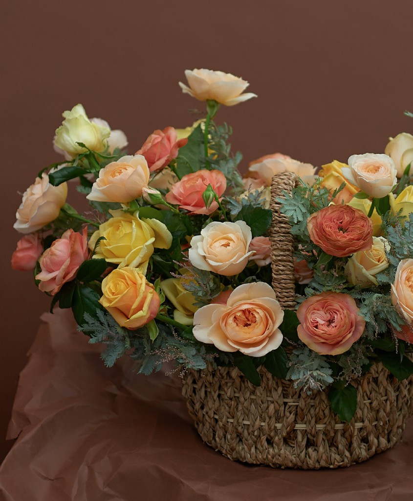 Корзина с ручкой размер L, розы одноголовые и кустовые и сезонная зелень (длина комопозиции до 1м).