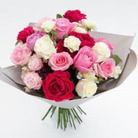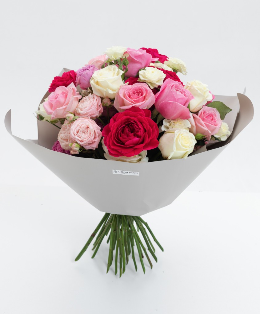 Сборный букет в ярко-розовой цветовой гамме из 4х форм роз: кустовых, пионовидных, кустовых пионовидных и одноголовых.