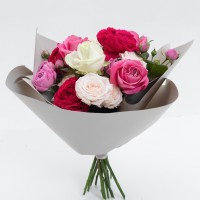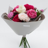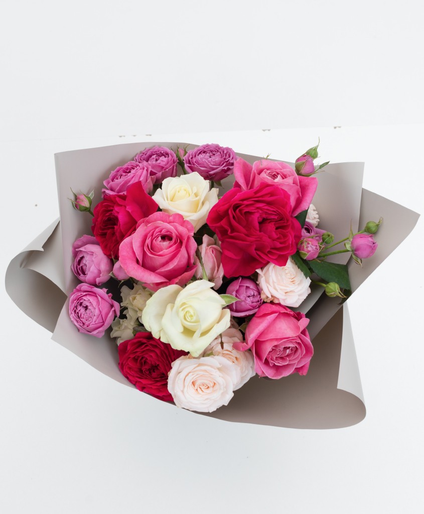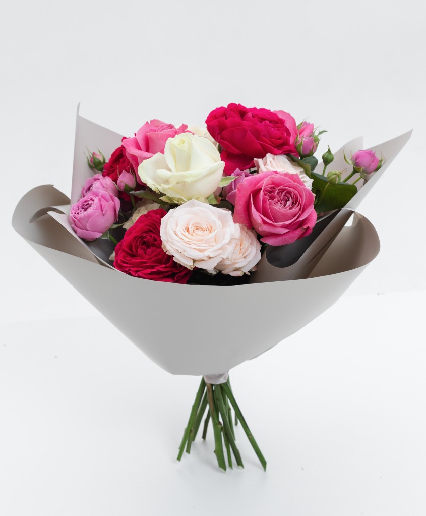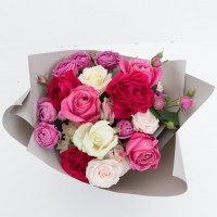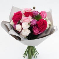 Сборный букет в ярко-розовой гамме из 4х форм роз: кустовых, пионовидных, кустовых пионовидных и одноголовых.