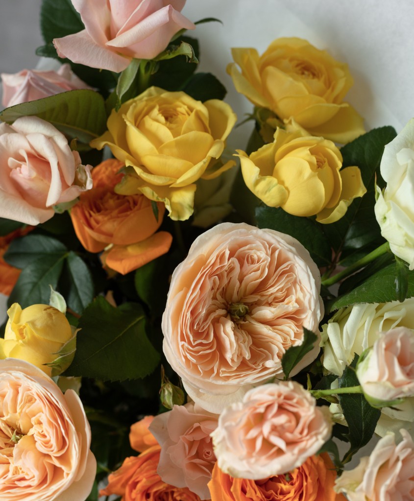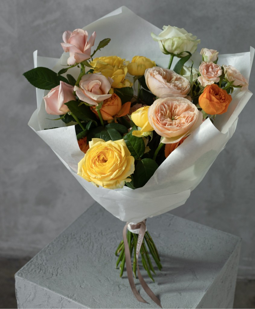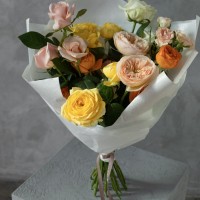 Сборный букет в желтой, оранжевой, персиковой гамме из 4х форм роз : кустовых, пионовидных, кустовых пионовидных и одноголовых.